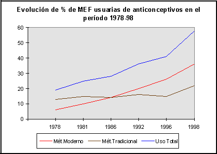 Como se puede observar hay un incremento importante en el uso de métodos modernos; en 20 años su utilización se sextuplicó, pasando de 6% al 36% de prevalencia. Se observa que el uso de métodos tradicionales también se incrementó, pero en menores proporciones, en consecuencia el uso total entre todas las MEF del país se incremento sustancialmente, pasando del 19% en 1978 al 58% en 1998. (gráfico 1)