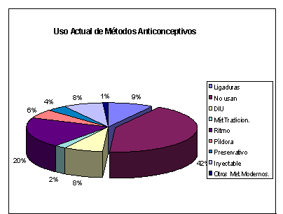 Los anticonceptivos se han agrupado en métodos modernos y tradicionales. · Los métodos modernos son: la píldora, DIU, inyectable, norplant, óvulos, espumas, preservativos, ligadura de trompas y vasectomía. · Los métodos tradicionales son: la abstinencia periódica o ritmo, retiro y los denominados folklóricos. El uso de algún método anticonceptivo se ha ido incrementando con el tiempo y variando en su composición, hace 20 años eran usados más los métodos tradicionales que los modernos; dado que su difusión era muy reservada y sólo estaba al alcance de las mujeres más educadas y con mejores condiciones económicas. Es a partir de los años 90 que se inicia en el país una política de población algo más agresiva y los programas de gobierno logran coberturas más amplias, cambiando de este modo la prevalencia de uso de los métodos modernos, los que superan a los tradicionales en casi todos los ámbitos geográficos del país.