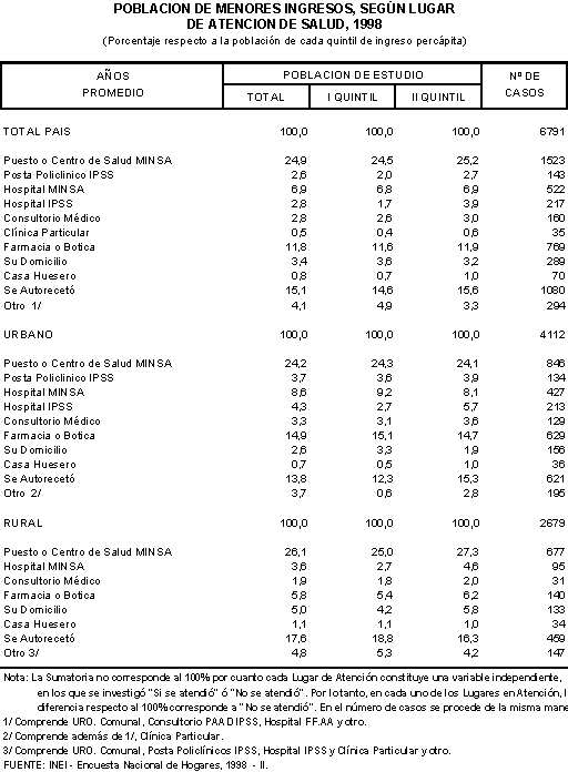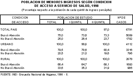 Según información de la ENAHO de 1998 una importante proporción de población de menores ingresos que presentó evidencias de enfermedad o accidente busca atención para el tratamiento de dicha situación. En efecto, las tres cuartas partes (75%) de la población de estudio, a nivel nacional, buscó alguna forma de tratamiento. A nivel de los quintiles de ingreso se advierte un porcentaje ligeramente mayor de acceso en el caso de la población del I quintil (73,6%) que el registrado por la población que corresponde al II quintil (73,3%).