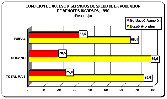 Mientras el 79,5% de la población urbana de menores ingresos buscó atención para su enfermedad o accidente, la proporción de población rural que acudió a atenderse disminuye a 66,4%.