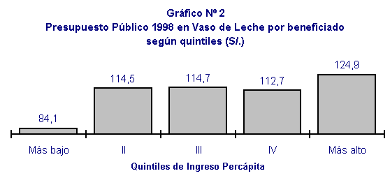 El análisis a nivel individual corrobora lo anterior. El Gráfico Nē 2 muestra que en promedio el beneficiado del quintil más alto (más rico) recibe en promedio una transferencia estatal por vaso de leche que es 49 % más elevado que el de un beneficiado del quintil más pobre.