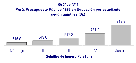 Lo anterior se corrobora al hacer el análisis a nivel individual. Si se tiene en consideración que el acceso de los pobres, a niveles educativos con mayor presupuesto público por persona (por ejemplo, superior universitaria) es reducido y mayor a niveles educativos con menor presupuesto (por ejemplo, educación primaria), entonces, no es difícil deducir que el beneficio promedio de un pobre por los servicios de la educación estatal es más bajo que el de un rico. El Gráfico Nº 1, muestra que, en efecto, el estudiante del quintil más alto (más rico) recibe en promedio una transferencia estatal por educación que es 78 % más elevado que el de un estudiante del quintil más pobre.