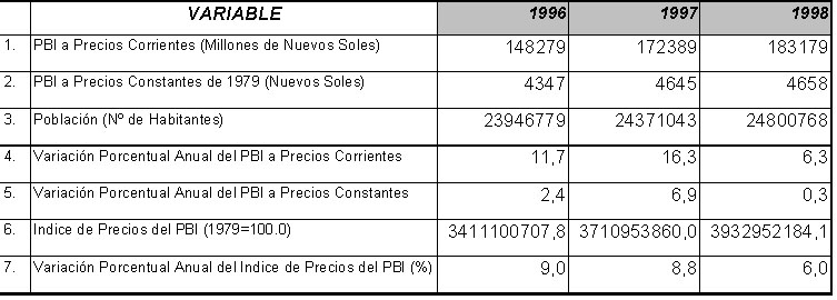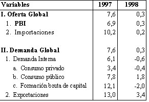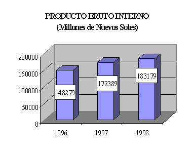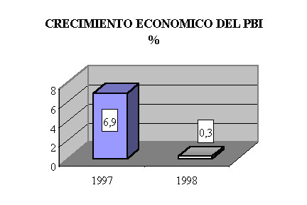 Durante el año 1998, tanto la economía nacional como la internacional, se vieron afectadas negativamente en su desempeño por una serie de eventos como el Fenómeno del Niño, las crisis asiática y brasileña, entre otros. El Producto Bruto Interno del país, experimentó en 1998 un incremento de 0,3% respecto al registrado en 1997.