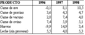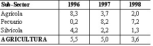 ![]() SECTOR AGROPECUARIO Para 1998, el Producto Bruto Interno de la actividad agricultura ha mantenido un comportamiento positivo, registrando un crecimiento de 3,6% con respecto al año anterior, a pesar de la presencia del Fenómeno del Niño, el cual modificó las condiciones climatológicas lo que incidió en el comportamiento agropecuario del país. Este crecimiento se sustenta en el aumento de la producción agrícola (2,0%), pecuaria (7,2%) y silvícola (1,3%).
