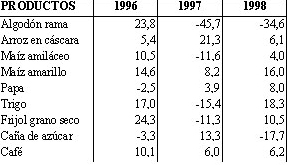 SEGUN SUBSECTORES : 1996-1998 (Variaciones Porcentuales) ![]() La producción agrícola se incrementó en 2,0%, a pesar que la presencia del Fenómeno del Niño provocó grandes contracciones en el volumen de producción de algunos productos, tales como el algodón en rama, la vid y la caña de azúcar que cayeron en 34,6%, 33,5% y 17,7% respectivamente. Sin embargo, productos como el trigo (18,3%), maíz amarillo (16,0%), frijol grano seco (10,5%) y papa (8,0%) mostraron incrementos en su producción. La producción de trigo se recuperó de la grave contracción sufrida el año anterior, debido al incremento en la superficie cosechada que pasó de 111 mil a 125,9 mil hectáreas. Estos incrementos se dieron principalmente en los departamentos de La Libertad, Cajamarca, Junín y Ayacucho. El maíz amarillo mantuvo un comportamiento positivo respecto a años anteriores, registrando un 16,0% de crecimiento, el cual estuvo influenciado por los mejores rendimientos por hectárea de la superficie cosechada en los departamentos de Piura, Lima y La Libertad. Con respecto al frijol grano seco, éste logró recuperarse de la caída sufrida en el año anterior al mejorar sus niveles cosechados que llegaron a 75,1 mil hectáreas, los cuales se reflejaron en el incremento de la producción en 10,5%, siendo los departamentos de Amazonas, Arequipa y Ucayali los que mayor incremento de superficie cosechada y rendimiento mostraron. La producción de papa alcanzó a 2589,3 mil toneladas métricas de producción lo que significó un crecimiento de 8,0%, como reflejo del aumento en el área cosechada de 248,5 mil a 268,8 mil hectáreas. En este caso, destaca el nivel de producción alcanzado por los departamentos de Puno que registró altos niveles de producción, así como La Libertad, Cajamarca, Huánuco, Junín y Huancavelica.