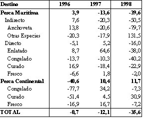 HIDROBIOLOGICOS SEGUN DESTINO : 1996 - 1998 (Variación Porcentual) ![]() Asimismo; el desembarque marítimo destinado al consumo humano directo decreció en 16,0%, siendo más afectado el rubro destinado para congelado que presentó una disminución de 40,2%. A pesar que el Fenómeno del Niño trajo consigo la aparición de especies de agua caliente, sin embargo, la extracción destinada a congelado, enlatado y curado presentaron resultados negativos del orden del 40,2%, 38,0% y 22,9% respectivamente. La extracción total en el litoral fue de 4310,3 miles de t, cifra que representa el 99,1% del desembarque nacional, de los cuales el 85,8% ha sido dirigido al consumo humano indirecto, mientras que el 14,2% estuvo destinado al consumo humano directo. En lo que se refiere al desembarque de recursos hidrobiológicos para la producción de harina y aceite de pescado, el recurso anchoveta representó el 27,9% de la extracción total en el litoral con 1205,5 miles de t, mientras que la captura de otras especies alcanzó las 2490,7 miles de t significando el 57,8% del desembarque total marítimo. Con respecto al consumo humano directo, se observa que los rubros de mayor representatividad fueron los desembarques destinados al consumo fresco con 249,1 miles de t y al enlatado con 218,1 miles de t, los mismos que representaron el 40,8% y 35,5% del desembarque destinado al consumo humano directo, mientras que para la extracción total marítima representan 5,8% y 5,1%, respectivamente. A pesar del comportamiento negativo de la extracción marítima, la pesca continental tuvo un incremento de 11,7%, siendo la extracción destinada para curado la que refleja un aumento de 30,9%, mientras que lo destinado al congelado y consumo fresco disminuyeron en 7,3 y 7,2 por ciento, respectivamente. El desembarque total de recursos hidrobiológicos en ríos y lagos representó el 0,86% de la extracción nacional, destinado en su totalidad al consumo humano directo. Es necesario mencionar que debido a la disminución paulatina del efecto del Fenómeno del Niño o sea la normalización de las condiciones climatológicas del mar y a la consecuente mayor captura de anchoveta y samasa (anchoveta blanca) permitida por el Ministerio de Pesquería a través de la R.M. Nº 503 - 98 - PE, se ha observado una recuperación del sector, por otro lado se debe destacar la presencia de otras especies destinadas al consumo humano indirecto como caballa, jurel y pez volador.