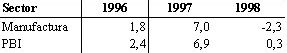 1996 - 1998 ![]() Respecto a la producción fiscalizada de gas natural, se ha incrementado considerablemente en 1998, mostrando un crecimiento de 69,2% respecto del año anterior, debido a que se han incorporado en la explotación de este producto las empresas Sapet y Aguaytía, ésta última con 4 140 244 miles de P3 los que representan el 28,7% de la producción total de gas la cual asciende a 14 431 906 miles de pies cúbicos. SECTOR MANUFACTURA Al analizar el comportamiento de la actividad manufacturera para el período 1998, se observa que ésta se ha desarrollado bajo dos contextos: la industria que está exportando y que seguirá su interesante ritmo de crecimiento aunque un poco más lento que el año 1997 y la industria manufacturera tradicional. La dinámica que venía mostrando la Industria Manufacturera, en el período 1996 (1,8%) y 1997 (7,0%) se vio contrarrestada con la contracción del sector en el siguiente año, experimentando una caída de 2,3%, debido a dos aspectos importantes: la Crisis Asiática y al Fenómeno del Niño, que trajeron como consecuencia la falta de liquidez que obstaculizó el desarrollo empresarial de la pequeña y mediana empresa industrial, ya que los agentes financieros como: cooperativas, financieras, bancos, etc., prefirieron destinar sus inversiones a clientes de mayor envergadura, a los que usualmente asocia con un menor riesgo.