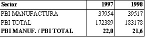 (Variación Porcentual anual) ![]() Por otro lado la reducción del crédito determinó la disminución del poder adquisitivo en la población, lo que evidentemente generó un estancamiento en los niveles de consumo. Todos estos aspectos negativos, desfavorecieron al sector de tal manera que vio disminuida su participación económica con respecto a la economía del país. Así, de 22.0% que representó en 1997, pasó a un 21.6% para el período 1998. Es interesante señalar que al desenvolvimiento negativo de este sector, contribuyeron en gran manera la Industria Alimenticia que luego de mostrar un expectante incremento en 1997 (5,7%) disminuyó en 10,9%, así también mostraron contracciones las actividades de Conservas y Productos Congelados de Pescado (-50,7%), Harina y Aceite de Pescado (-49,4%), Elaboración y Refinación de Azúcar (-30,3%), Productos Farmacéuticos y Medicamentos (-24,6%), entre otros.
