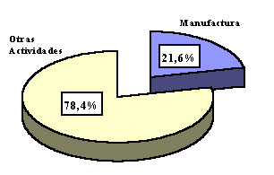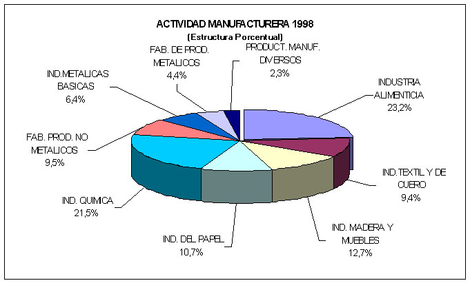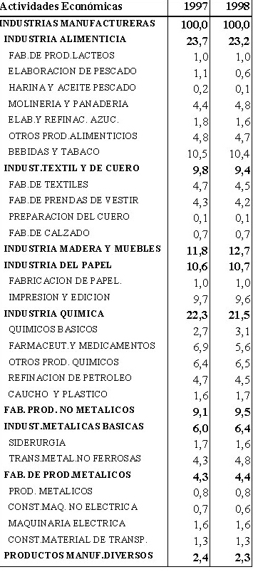 MANUFACTURERAS AL PBI DEL SECTOR 1997-98 ![]() Con respecto a la participación para el año 1998 de los subsectores en la Industria Manufacturera, destacan la actividad productora de alimentos a y la actividad de productores químicos, que participan con un aporte de 23,2% y 21,5%, respectivamente. En la actividad productora de alimentos, el conjunto de establecimientos dedicados a la producción de bebidas y tabaco, tiene la mayor participación con 10,4% siguiendo la actividad de molinería y panadería con 4,8% y la actividad de fabricación de otros productos alimenticios con 4,7%. Es preciso mencionar que la rama de harina y aceite de pescado que muestra una participación de sólo el 0,1%, es el segundo sector de mayor exportación después de la minería. Por otro lado, en la industria química, la fabricación de otros productos químicos aporta el 6,5%, seguido de la producción de productos farmacéuticos y medicamentos con 5,6%. La industria de maderas y muebles participa con 12,7%, incrementando su participación al registrado en 1997, que fue de 11,8%, debido a que esta industria muestra un gran potencial de desarrollo. Con respecto a la industria de fabricación de maquinaria y equipo, éstas no logran tener relevancia en cuanto a su participación en la industria manufacturera, debido a la falta de equidad frente a la competencia de productos importados, básicamente en términos de financiamiento y además por ser una industria incipiente. Las ramas que la componen tienen las siguientes participaciones: productos metálicos con 0,8%, construcción de maquinaria no eléctrica 0,6%, construcción de maquinaria eléctrica 1,6% y la construcción de material para transporte con 1,3%.