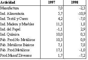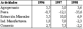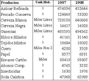 INDUSTRIALES 1997 - 1998 (Variación Porcentual) ![]() La producción de azúcar, también mostró una fuerte contracción, debido fundamentalmente a que mas del 50% de las cooperativas han dejado de producir caña de azúcar por el retraso en la etapa de maduración por la presencia del Fenómeno del Niño, además estas industrias se enfrentaron a una fuerte importación de azúcar. La producción de los otros productos alimenticios, y la industria de bebidas y tabaco, registraron decrecimientos en el orden de 2,7% y 2,9% respectivamente. En cuanto al comportamiento negativo de la actividad de bebidas y tabaco; este se debió a la menor producción de cerveza blanca en -12,0%; lo que no pudo contrarrestar el crecimiento de la producción de bebidas gaseosas. La producción de productos textiles disminuyó en 8,4%, así como la producción de cueros en -15,9%, este comportamiento estuvo asociado a la reducción de la demanda, así como también al ingreso masivo de productos importados de origen principalmente asiático, en condiciones muy ventajosas. El crecimiento de 1,8 por ciento de la industria de maderas y muebles, fue promovido principalmente por la demanda de los países europeos de muebles tallados de artesanía manual; teniendo nuestro país un gran potencial de desarrollo. La industria de papel y de impresión, registró crecimientos de 3,6 y 2,7 por ciento, respectivamente. El desarrollo favorable de estas actividades se origina en la mayor demanda de las otras actividades productivas principalmente de las que se dedican a la exportación. La industria química presentó un leve crecimiento de 0,3%, a pesar de la fuerte contracción de la producción de productos farmacéuticos y medicamentos (-24,6%), pero que fue contrarrestado con la evolución favorable de la producción de químicos básicos (13,2%).