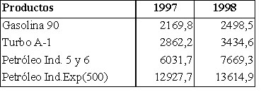 PRODUCTOS 1997 - 98 ![]() Con respecto a la refinación de petróleo, esta actividad muestra un crecimiento de 1,5 %, resultado de ello, hubo una mayor producción de gasolina de 90 octanos, turbo A1 y petróleo industrial que crecieron en 15,2%, 20% y 27,2% respectivamente, además del proceso de recuperación que viene mostrando la Refinería La Pampilla.