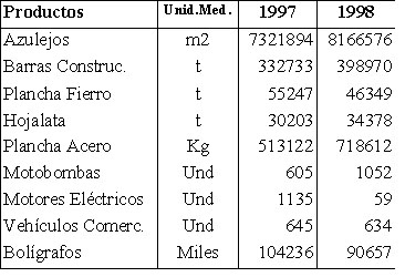 POR PRODUSTOS 1997 - 98 ![]() La industria metálica básica presentó una dinámica positiva de 7,8 por ciento, como resultado de las inversiones realizadas por las principales empresas del sector (SIDERPERU y Aceros Arequipa), con el fin de modernizar la empresa, conllevando a una reducción de costos. Cabe destacar además, que este sector se vio favorecido posiblemente por la demanda del sector construcción. La producción de productos metálicos mostró un crecimiento de 2,9 por ciento, menor al registrado en 1997 que fue de 27,8 por ciento, debido fundamentalmente a los efectos del Fenómeno del Niño, que afectó seriamente a la producción pesquera y con ello, la producción de envases para conservas de pescado, así como también la expansión de la producción de envases de cartón, que redujo la demanda de tapas, tanto para bebidas como para frascos. En cuanto a la producción de maquinaria y equipo, ésta se vio afectada por la falta de liquidez del sistema financiero, que originó una inaccesibilidad a créditos bancarios y por ende a la inversión privada. La contracción mostrada en la construcción de materiales de transporte (2,5%) se debe a la reducción registrada por la producción de vehículos automotores comerciales, por la disminución en la producción de motores.