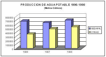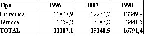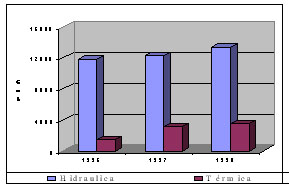 1996 - 1998 (Gwh) ![]() En lo que respecta al tipo de generación por un lado, el hidráulico alcanzó 13349,8 Gwh representando el 79,5% del total de la producción; y alcanza un crecimiento de 8,8% en relación a 1997, siendo los sistemas centro norte y aislados los que incrementaron su producción en 15,8% y 23,2% respectivamente. Por otro lado, la generación del tipo térmico representó el 20,5% del total generado; y creció en un 11,6% donde el sistema sur alcanza un aumento del 99,2% mientras que los sistemas norte y aislados disminuyeron su producción en 16,8 y 34,0 por ciento. Otros de los aspectos que coadyuvaron al mejor rendimiento del sector en general fue la disminución en los niveles de pérdida de energía en los sistemas de transmisión y subtransmisión, en cuanto al sistema de distribución se lograron disminuir los niveles de pérdidas reales a través de una mayor eficiencia en la inspección selectiva de las conexiones y funcionamiento de medidores, para evitar el hurto o fraude. En cuanto a las empresas de saneamiento y alcantarillado también alcanzaron un incremento en sus volúmenes de producción llegando a 9,8% de crecimiento.
