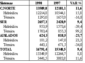 (Gwh) ![]() En 1998 la producción total de energía de las empresas de servicio público alcanzó a 16791,4 Gwh superior en 9,4% a la producción del año pasado, de las cuales en el sistema centro norte y sur se generaron 13509,8 y 2657,3 Gwh producción mayor en 11,6%, y 9,4% respecto a 1997, mientras que en los sistemas aislados hubo una disminución del 23,7% en relación al mismo período. En lo que respecta al sistema Centro Norte las empresas ELECTROANDES y la Empresa Eléctrica de Piura son las que obtuvieron una mayor producción, seguidas de ELECTROPERU y EDEGEL; asimismo en el Sistema Sur las empresas ENERSUR y EGASA también tuvieron crecimientos positivos.