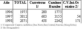 CAMINOS RURALES 1996 - 1998 AVEANCE FISICO - KILOMETROS ![]() Asimismo, a partir del mes de setiembre se comenzó con la reconstrucción de infraestructura en agricultura, vivienda, salud, educación, carreteras y saneamiento en las diversas zonas del país que fueron afectadas por el Fenómeno del Niño y el avance en la construcción del Corredor Vial Interoceánico del Sur Ilo-Desaguadero. Cabe mencionar que la crisis externa que se inició en 1997 y se agravó a mediados de 1998 afectó la economía del país, produciendo menor actividad en los sectores de la producción. En este contexto, el sector construcción ha sido afectado, principalmente los últimos meses del año debido a la crisis de liquidez, ocasionando el aplazamiento de proyectos de obras privadas.
