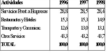 Los servicios prestados a empresas es el mas representativo del sector servicios con un peso de 28,4%; la actividad de Restaurantes y Hoteles representa 14,9%; la actividad de Transportes y Comunicaciones tiene un peso de 13,1%; las demás actividades en conjunto representan 43,7%.