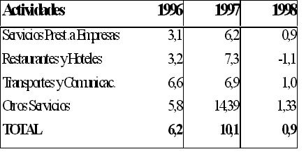 (Estructura Porcentual) ![]() La actividad de servicios financieros comprende a la banca múltiple, empresas financieras, empresas de arrendamiento financiero, cajas municipales, cajas rurales, cooperativas de ahorro y crédito y las otras instituciones dedicadas a la intermediación financiera en el mercado nacional. El sector financiero experimentó en 1998 un leve crecimiento de 0,3 %. Este ligero incremento observado se debe a la restricción de los créditos provenientes del exterior, como consecuencia de la crisis asiática y rusa. Así como, de la menor intermediación financiera producto del daño producido por el Fenómeno del Niño. La actividad de Transporte y Comunicaciones registra un crecimiento de 1,0 % con relación al periodo anterior, debido principalmente al incremento en la importación de vehículos de transportes; el aumento de visitantes extranjeros y a la mayor demanda interna del servicio. La actividad de servicios prestados a empresas presenta el mayor crecimiento de las actividades más representativas del sector con un crecimiento de 0,9 % para el año de 1998 La actividad de servicios a hogares mercantes registra un crecimiento sostenido de 3,2 % para el año de 1998. La actividad de restaurantes y hoteles para 1998 registra una contracción de 1.1 % debido a la disminución de la demanda del servicio de alimentación y bebida a pesar que el ingreso de turistas al país en este año superó en 72 mil 931 turistas respecto a lo registrado en 1997 que fue 746 mil 599 turistas.