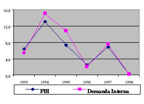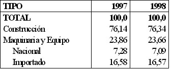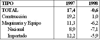 La formación bruta de capital fijo para el año 1998, registró una caída de 0,6 por ciento, debido principalmente a la crisis financiera internacional que trajo consigo la paralización de las inversiones, tanto nacionales como extranjeras, afectando sobretodo las adquisiciones de maquinaria y equipo. Este comportamiento ocasionó que la participación de la formación bruta de capital fijo en el PBI para el año 1998 fuera de 22,9% siendo menor al alcanzado en 1997, que fue de 23,4% . Cabe mencionar que la formación bruta de capital, por origen, está compuesta por un lado, por todas aquellas grandes construcciones que se realizan en el país y por otro lado, por aquellos productos que conforman la inversión en maquinaria y equipo; en la medición de los primeros se considera a las construcciones de viviendas, edificios, otras construcciones y el mejoramiento de tierras; y, en el segundo se considera a la inversión realizada en maquinaria y equipo para la agricultura, minería, industria y comercio, así como a las maquinas de oficina, contabilidad y computo entre otros tipos de maquinaria diversa, la cual comprende a todos estos bienes tanto de origen nacional como importado, que tienen como destino la formación bruta de capital fijo. Así, se tiene que la inversión en construcción en 1998, presentó un crecimiento de 1,0% debido básicamente por la inversión pública en los trabajos de prevención que se realizaron por los efectos del Fenómeno del Niño y a la ejecución de obras de infraestructura. Con respecto a la inversión privada, ésta se vio afectada por problemas de liquidez y el alza de las tasas de interés para los créditos hipotecarios, que redujo la continuación de obras, principalmente en la construcción de centros comerciales. En cuanto a la evolución desfavorable de la inversión en maquinaria y equipo de -6,2 por ciento, este resultado se vio influenciado por el comportamiento negativo mostrado en la inversión de maquinaria y equipo de origen importado que cayó en 5,9%, debido a los menores niveles de importación de maquinaria industrial que realizaron a pesar que el material de transporte, tractores y motocultores presentaron evoluciones positivas. Asimismo, en este comportamiento también influyó la inversión en maquinaria de origen nacional que presentó una caída de 7,1% debido a la contracción mostrada en la fabricación de las diversas maquinarias, así como en la producción de vehículos automotores.