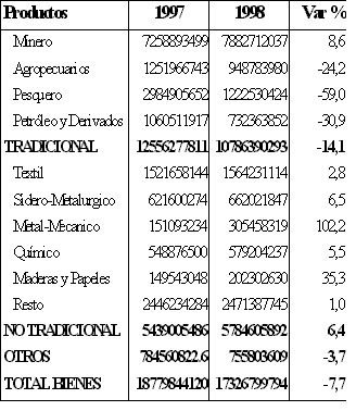 Las exportaciones de bienes y servicios están constituidas por todas las ventas de bienes de los residentes de un país a los no residentes y de los servicios proporcionados por los productores del país a los no residentes. Las exportaciones se valoran a precios FOB, valor que corresponde al precio de mercado de los bienes en la frontera del país exportador. Las exportaciones de bienes para 1998 representan el 80,8% del total exportado y se agrupan en productos tradicionales y no tradicionales.