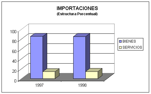 (Estructura Porcentual) ![]() Así las importaciones de bienes representan el 85% del total y alcanzó la suma de 26350 millones de soles mayor en 1707 millones respecto a 1997, dicha evolución estuvo asociada a las mayores compras en bienes de consumo , materias primas y productos intermedios para la industria principalmente. Las importaciones de bienes de consumo no durado se incrementaron en 16,8% respecto al año 1997 destacando los productos alimenticios como el azúcar, café etc., productos farmacéuticos y de tocador.. Por su parte la importación de bienes de consumo duradero alcanzaron 2381,7 millones de soles mayor en 1152,1 a la registrada en 1997, este aumento estuvo asociada a las mayores adquisiciones de vehículos de transporte particular.