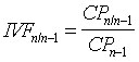 n-1 = año anterior i = producto i-ésimo X = Valor constante del producto i-ésimo IVF = Variación porcentual del Indice de Volumen físico del año n respecto al año n-1 El cociente de dividir el total de valores constantes de los productos del año n entre el valor de los mismos en el año n-1, representa la variación del índice de volumen físico para el consumo privado, el que se aplica al consumo privado constante del año anterior y se obtiene el consumo privado constante del año n.