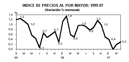 El Indice de Precios al por Mayor, indicador que muestra la variación de precios en las transacciones, entre las empresas productoras y los comerciantes minoristas, experimentó un crecimiento de sólo 0,3%. La variación acumulada de los precios mayoristas en los cuatro primeros meses de 1997 fue de 0,84%, registrando una variación anual de 8,35%. PRECIOS AL POR MAYOR DE ORIGEN NACIONAL REGISTRARON UN INCREMENTO DE 0,26%