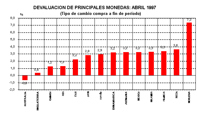 Al cierre de abril de 1997, el dólar estadounidense se revaluó respecto a las principales monedas europeas y al yen japonés, en comparación a la cotización del 31 de marzo. Cabe destacar que el dólar australiano se depreció en 0,6%.