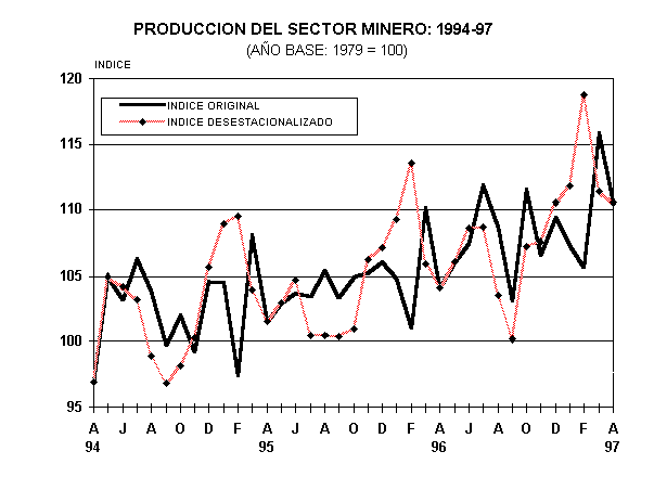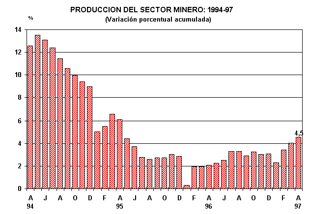 La producción del sector minero en abril de 1997 aumentó en 6,1%, en relación a similar mes de 1996. Este resultado es explicado por los mayores niveles de producción de petróleo y de todos los minerales metálicos, a excepción del hierro.