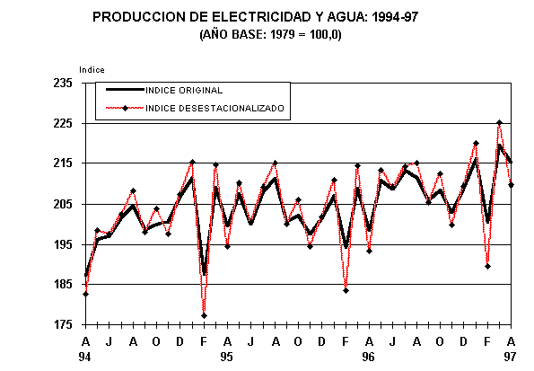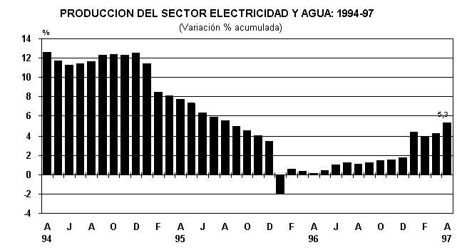 El sector Electricidad y Agua en abril de 1997, creció en 8,5% respecto a similar mes de 1996. Este resultado es producto de la mayor generación de energía eléctrica.