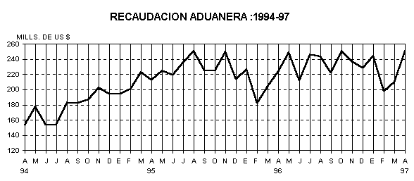 En abril 1997, la Recaudación Aduanera a nivel nacional se ubicó en 250 millones de dólares, que en moneda nacional se traducen en 666 millones de nuevos soles, mostrando un incremento de 11,9%, equivalente a 26 millones 600 mil dólares más, respecto a similar mes del año anterior. Durante enero-abril de 1997, la recaudación se incrementó en 8,1%, respecto a similar período del año anterior.