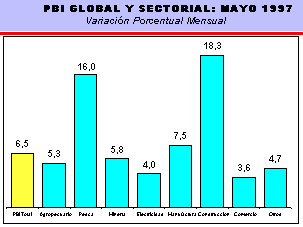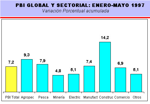 El dinamismo que viene mostrando la producción nacional, en los primeros cinco meses de 1997, se sustenta en los mayores niveles de producción que registran los sectores, Agropecuario (9,3%), Pesca (7,9%), Manufactura (7,4%) y la actividad de la Construcción (14,2%), que crecieron en tasas superiores al resultado del PBI global.