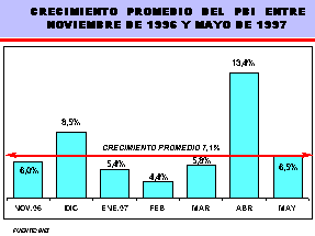 Entre noviembre de 1996 y mayo de 1997, la economía peruana ha crecido a un ritmo promedio mensual de 7,1%.