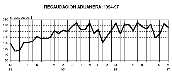 La Recaudación Aduanera en mayo de 1997, se ubicó en 234,1 millones de dólares, que en moneda nacional se traducen en 624,3 millones de nuevos soles, registrando una disminución de -6,0%, equivalentes a 15 millones de dólares menos, respecto a mayo de 1996. Sin embargo, durante enero-mayo de 1997, la recaudación aduanera mostró un incremento de 4,5% en relación a similar período del año anterior.