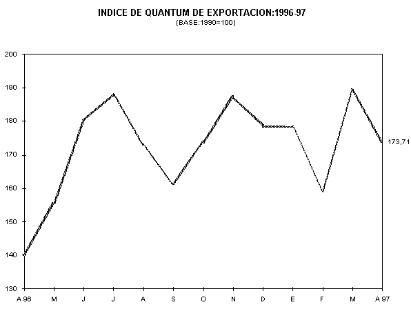El índice de quántum de las exportaciones en abril de 1997, se situó en 173,71, mostrando una disminución de 8,2%, respecto al volumen exportado en el mes precedente. Este resultado es explicado por las menores ventas hacia el exterior de la mayoría de los productos, con excepción del café y el petróleo.