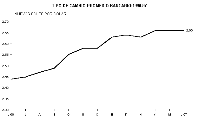 La cotización promedio compra - venta del dólar norteamericano en el sistema bancario en el mes de junio de 1997, fue de S/.2,66 por dólar, no registrando variación alguna respecto al mes anterior. En el mercado paralelo la cotización del dólar alcanzó los S/.2,655 por dólar, mostrando una variación porcentual negativa de -0,34%.