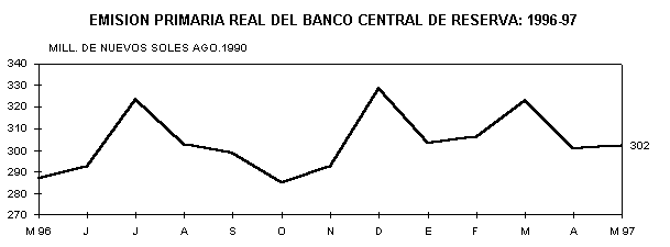 En mayo de 1997, la emisión primaria registró un saldo de 302 millones de nuevos soles de agosto de 1990, aumentando levemente en 0,3% en relación al nivel registrado a fines de abril del presente año. Este resultado se explica por la mayor afluencia de circulante en términos reales de 1,6%, viéndose parcialmente contrarrestada por la reducción de las reservas bancarias en 7,3%. Por origen externo, el incremento se debió a la compra de divisas por 221 millones de dólares en la Mesa de Negociaciones, atenuada por la venta de moneda extranjera de 59 millones de dólares al Tesoro Público. Por factores de origen interno, se explicó por la cancelación de 305 millones de nuevos soles de redescuentos otorgados por el BCRP a las empresas bancarias y a mayores depósitos por 71 millones de nuevos soles del sector público atenuados por vencimientos de CDBCRP en 20 millones de nuevos soles.