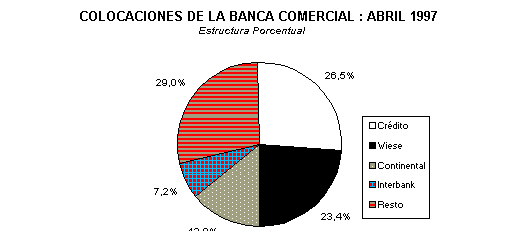 En Abril de 1997, las Colocaciones Totales de la Banca Comercial registraron un monto total de 30 mil 578 millones de nuevos soles, siendo el sector Industrial el que mayor nivel de Colocaciones experimentó con 7 mil 385 millones de nuevos soles, seguido del sector Comercio con 5 mil 371 millones de nuevos soles, Transportes con 1 mil 864 millones de nuevos soles y Otros Servicios Comunitarios con 6 mil 931 millones de nuevos soles.