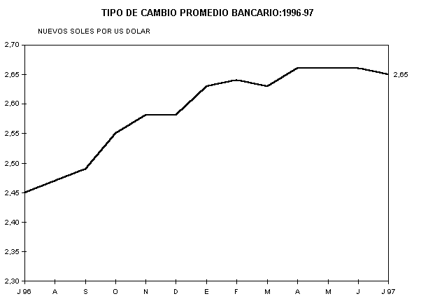 La cotización promedio compra - venta del dólar norteamericano en el sistema bancario en el mes de julio de 1997, fue de S/.2,65 por dólar, registrando una revaluación respecto al mes anterior de 0,38%. En el mercado paralelo la cotización del dólar alcanzó los S/.2,652 por dólar, mostrando una variación porcentual negativa de -0,11%.