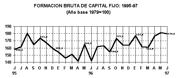 El Indice estimado de la Formación Bruta de capital fijo (FBK) en junio de 1997, se ubicó en 179,5 que comparado con el nivel registrado en junio de 1996, muestra un significativo incremento de 26,4%. Durante enero-junio de 1997, el índice de Inversión registró un incremento de 15,3%, en relación al índice observado en similar período de 1996.