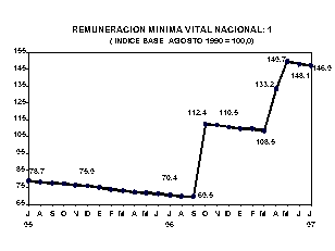 En julio de 1997, la Remuneración Mínima Vital (RMV), fijada para los trabajadores sujetos al régimen de la actividad privada, en su mayoría recién ingresados a laborar, ascendió a S/. 300,0 mensuales ó S/. 10,00 diarios. Este monto se estableció mediante el Decreto de Urgencia Nº 034-97 y entró en vigencia desde el 01 de mayo de 1997.
