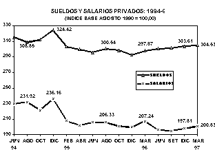 SUELDOS Y SALARIOS EN EL SECTOR PRIVADO DE LIMA METROPOLITANAEn el mes de marzo de 1997 el sueldo promedio mensual (Ejecutivos más Empleados) de la actividad privada se situó en S./ 1986,53, en el caso de obreros el salario promedio diario fue de S/. 25,22, según resultado trimestral de la Encuesta que realiza el INEI en convenio con el Ministerio de Trabajo y Promoción Social.