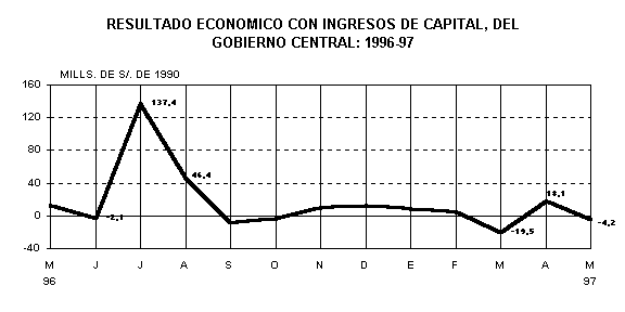 Durante enero-mayo de 1997, las Operaciones del Gobierno Central, sin considerar Ingresos de Capital, mostraron un Resultado Económico menor en -343,9%, respecto al registrado en similar período del año anterior. Sin embargo, el Resultado Económico, incluido el Ingreso de Capital registrado en este período, se situó en 9 millones 200 mil nuevos soles de 1990, inferior en -55,2%, al monto observado en similar período del año anterior.