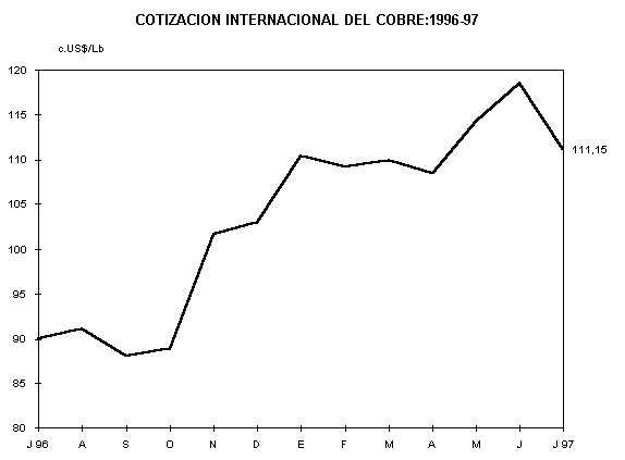 En comparación a julio de 1996, las cotizaciones del cobre (23,4%) y del zinc (52,2%) registraron alzas, mientras que, la plata (-13,3%), el plomo (-19,0%), el oro (-15,4%) y el petróleo(-6,4%), cayeron.