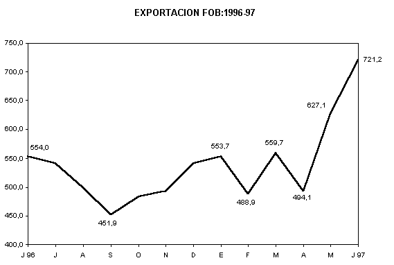 Las exportaciones tradicionales sumaron 529,1 millones de dólares en junio de 1997, monto superior en 71,8 millones de dólares (15,7%) respecto al mes anterior, debido a los mayores niveles de ventas de los productos agrícolas (111,3%) y pesqueros (36,2%).