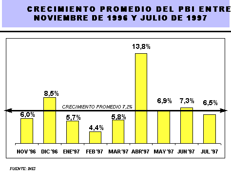 En los últimos 9 meses, la economía nacional viene registrando tasas positivas de crecimiento, alcanzando entre noviembre de 1996 y julio de 1997, un ritmo de crecimiento promedio mensual de 7,2%.