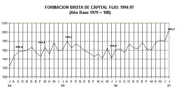 En julio de 1997, el Indice estimado de la Formación Bruta de capital fijo (FBK) se ubicó en 203,7 continuando así con su tendencia positiva observada desde el mes de diciembre último, este mes el crecimiento fue de 25,9% respecto al nivel observado en similar mes de 1996. Durante enero-julio de 1997, la inversión experimentó un incremento de 17,0%, en relación a similar período del año anterior.