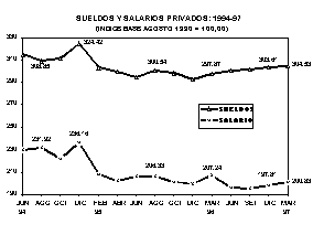 En el mes de marzo de 1997 el sueldo promedio mensual (Ejecutivos más Empleados) de la actividad privada se situó en S./ 1986,53, en el caso de obreros el salario promedio diario fue de S/. 25,22, según resultado trimestral de la Encuesta que realiza el INEI en convenio con el Ministerio de Trabajo y Promoción Social.
