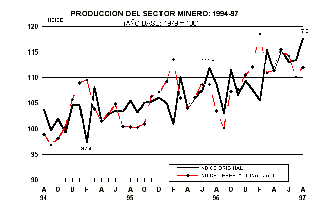 Durante el mes de agosto de 1997, el sector minero experimentó un crecimiento de 8,2%, en relación a similar mes de 1996. Este resultado es explicado por los mayores niveles de producción de todos los minerales metálicos.