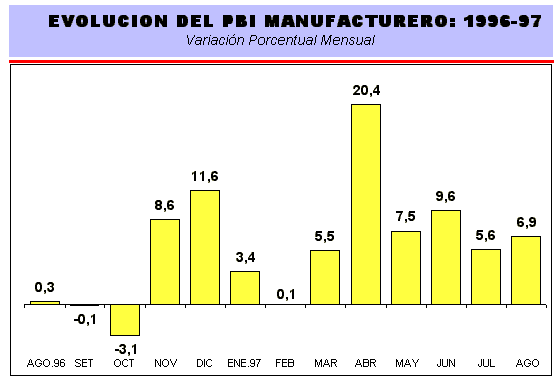 En los primeros ocho meses de 1997, la producción industrial creció en 7,3%. Este comportamiento responde al mayor incremento en la producción de Bienes de Consumo (8,8%), Bienes Intermedios (7,0%) y Bienes de Capital (3,4%).