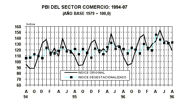 El sector comercio, durante el mes de agosto de 1997 registró un crecimiento en 9,2%, respecto al nivel alcanzado en similar mes del año anterior. El crecimiento observado en los sectores Manufactura (6,9%), Pesca (3,8%) y Minería (8,2%), originaron una mayor oferta de productos en los diversos circuitos comerciales del país